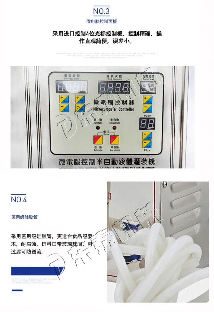 ① 本款醫用小型液體灌裝機是液體灌裝機中的一款暢銷產品,其采用變頻調速器,配進口高精度多圈電位器及可鎖表盤,使流量調節穩定準確,誤差負偏小于0.5%,正偏小于1.5%。