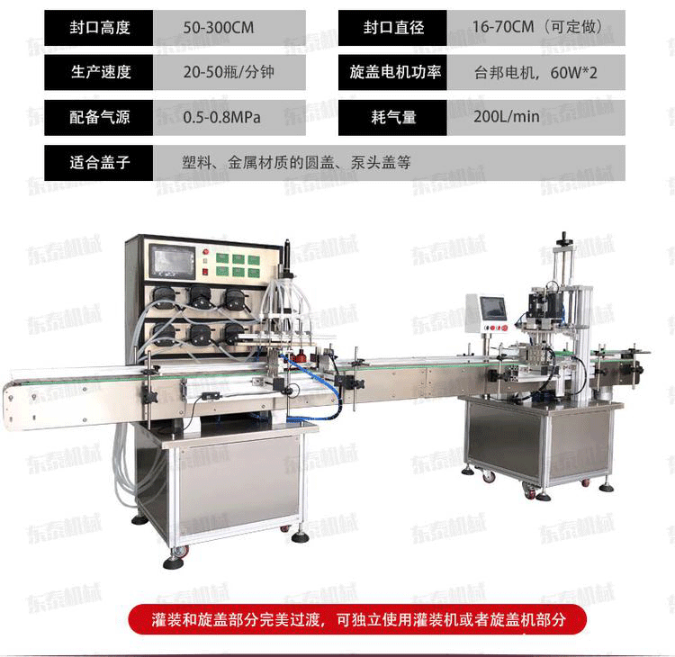 1、消毒水液體灌裝旋蓋線所有元件均采用,電機為優質臺邦電機,快捷更換蠕動泵管配置,清洗更方便。機身為鋁合金+不銹鋼。本機操作簡單、直觀方便,自動感應,無瓶不灌裝,灌裝和旋蓋部分過渡,可獨立使用灌裝機或者旋蓋機部分,另旋蓋機標配自動分瓶功能,方便小瓶旋蓋,性能穩定,可靠,效率高。